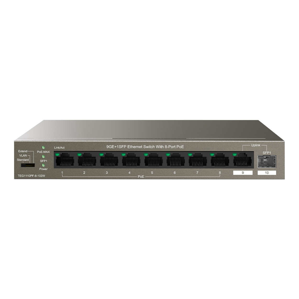 Ürün Adı: TENDA TEG1110PF-8-102W 8GE PoE Port (102W), 1xCombo Uplink Desktop Switch